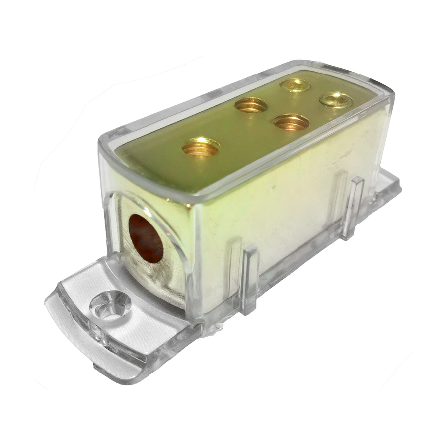 BLOQUE DISTRIBUIDOR DORADO ENTRADA 4 GA SALIDAS 4 X 8 GA
