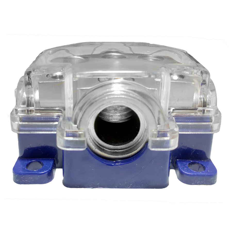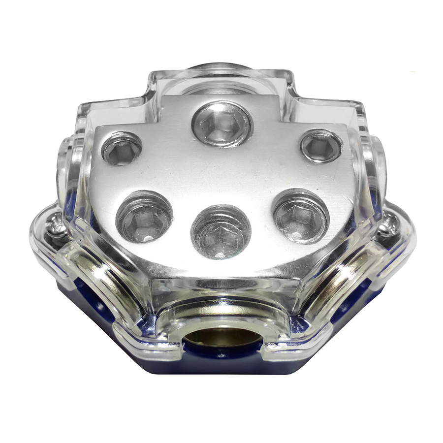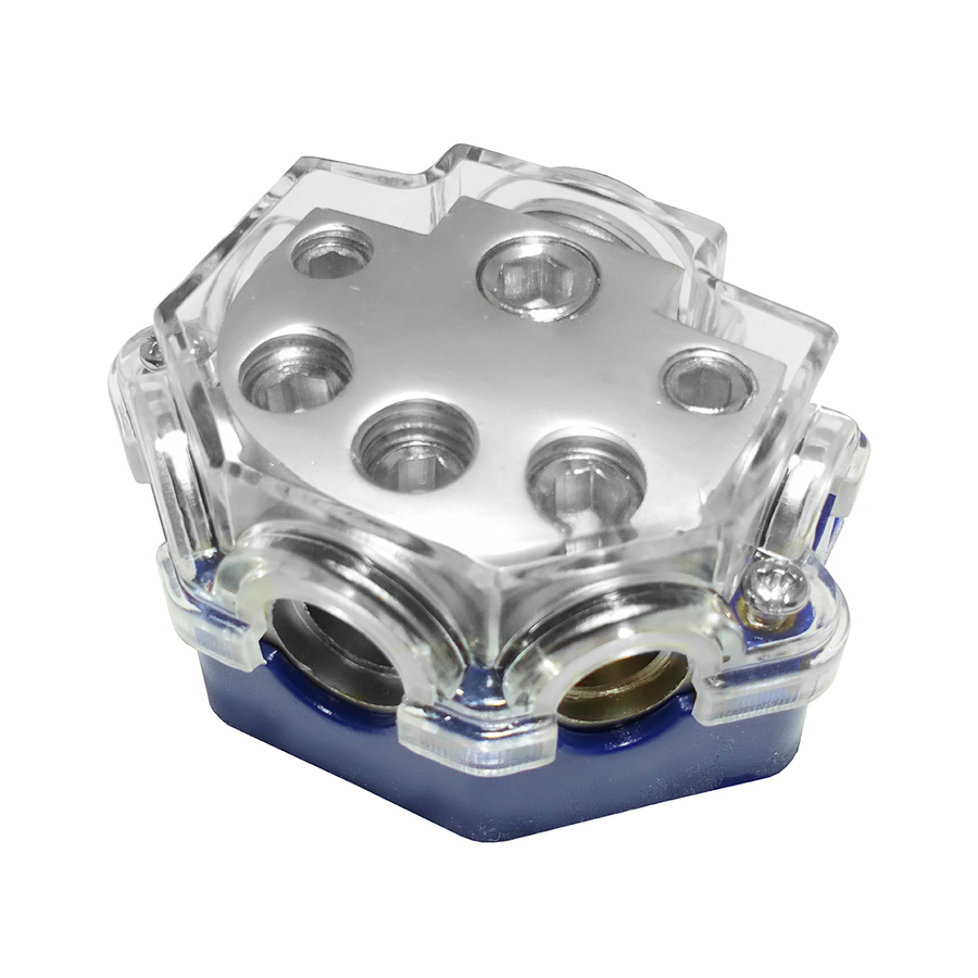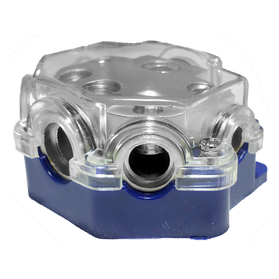 BLOQUE DISTRIBUIDOR PLATEADO (BASE AZUL) ENTRADA 1 X 0 GA SALIDAS 1 X 1 + 2 X 4 + 2 X 8 GA