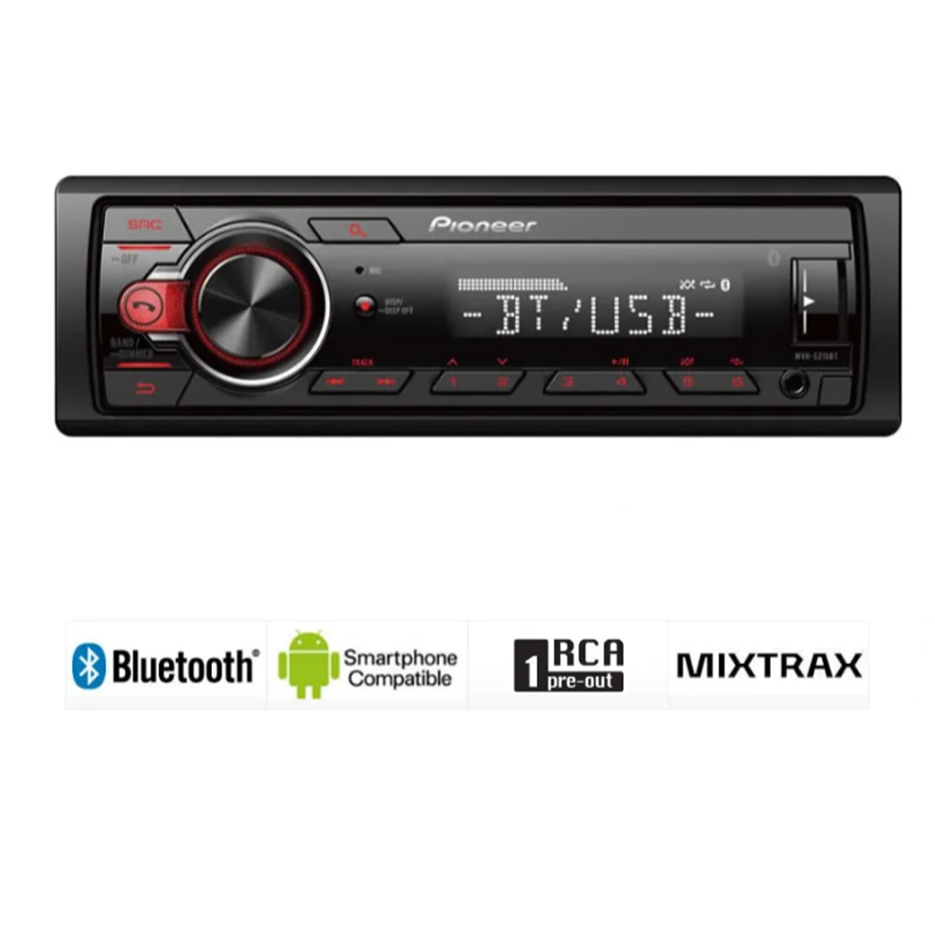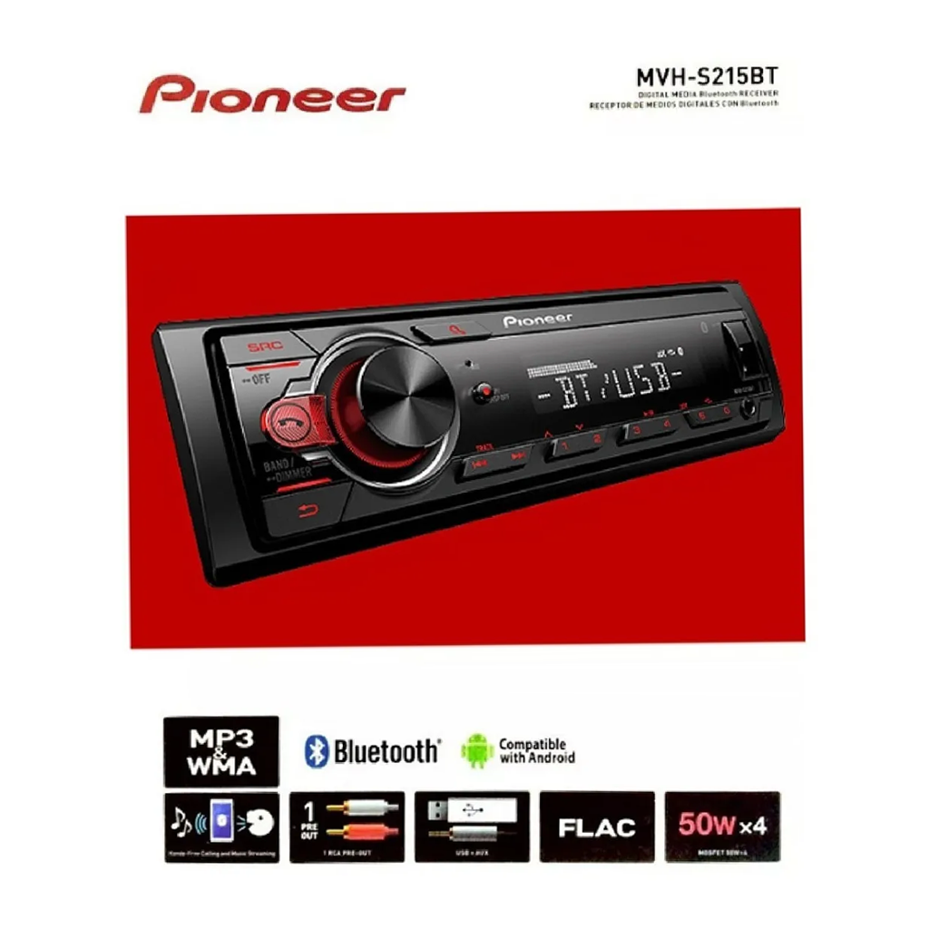 El Pioneer MVH-S215BT es un receptor digital compacto que ofrece Bluetooth para llamadas manos libres y streaming de audio inalámbrico. Compatible con algunos teléfonos Android a través de control directo USB, cuenta con un puerto USB iluminado y entrada auxiliar frontal. Reproduce formatos de audio como MP3, WMA, WAV, y FLAC, y viene equipado con 50W x 4 MOSFET para un sonido potente. Incluye una presalida RCA y Detachable Face Security para mayor seguridad contra robos.